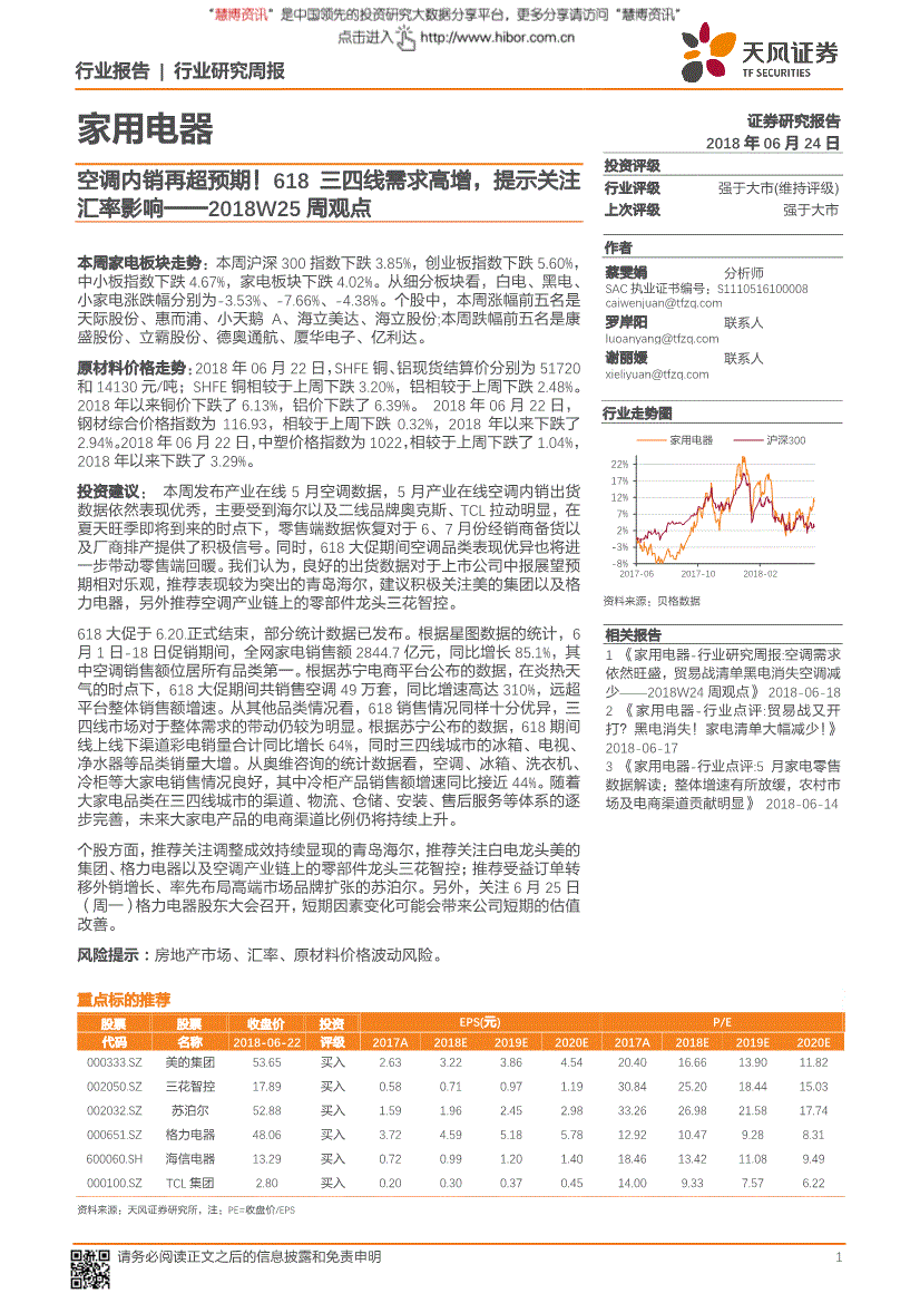 天风证券*行业研究*空调内销再超预期!618三四线需求高增,提醒关心汇率影响——2018W25周概念--家用电器行业演讲行业研究周报 1 家用电器证券研究演讲2018年06月24日投资评级行业评级强于大市(维持评级) 前次评级强于大市做者 蔡雯娟阐发师SAC执业证书编号:S08 罗岸阳联系人 谢丽媛联系人 材料来历:贝格数据 相关演讲1 《家用电器-行业研究周报!空调需求仍然兴旺,商业和清单黑电消逝空调削减——2018W24周概念》 2018-06-18 2 《家用电器-行业点评!商业和又开打?黑电消逝!家电清单大幅削减!》 2018-06-17 3 《家用电器-行业点评!5月家电零售数据解读:全体增速有所放缓,农村市场及电商渠道贡献较着》 2018-06-14 行业走势图空调内销再超预期!618三四线需求高增,提醒关心汇率影响——2018W25周概念本周家电板块走势:本周沪深300指数下跌3。85%,创业板指数下跌5。60%,中小板指数下跌4。67%,家电板块下跌4。02%。